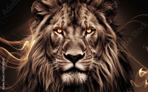 Fototapeta premium A large, powerful lion with a shrouded face and swirling flames and energy.