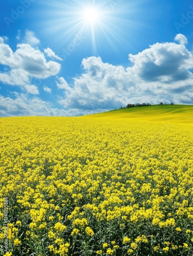 © b, Fototapeta premium A large rapeseed flower field under the blue sky