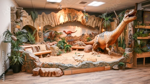 Fototapeta premium A large, realistic dinosaur model stands in a cave-like setting, surrounded...