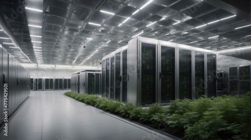 Obraz premium A large room with a lot of computers and plants. Generative AI.