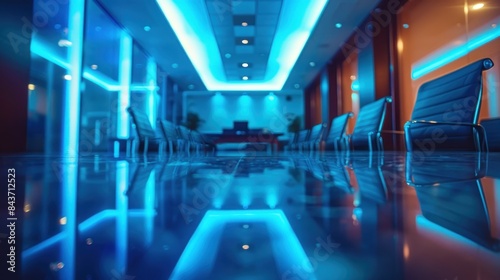 © Thanyaporn, Fototapeta premium A large room with blue lights and a lot of chairs