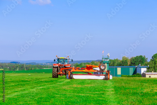© Yaroslav, Fototapeta premium A large rotary mower attached to a tractor mows the grass in the field near the building.