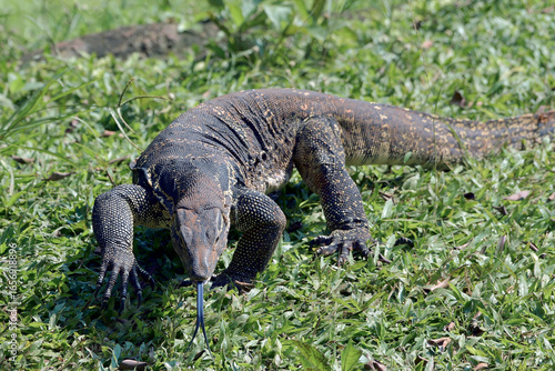 Obraz premium A large scaly monitor lizard in a grass. Wild Animals of Asia, Monitor lizard...