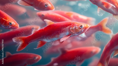 © Wall, Fototapeta premium A large school of small and larger red fish swimming together