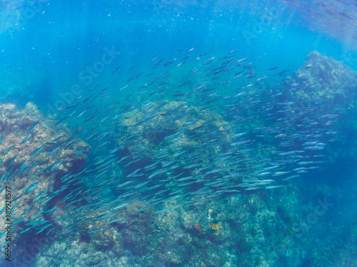 Fototapeta premium 美しいキビナゴ(ニシン科)他の大群。日本国静岡県伊豆半島賀茂郡南伊豆町中木から渡し船で渡るヒリゾ浜-2024年7月A large school of the Beautiful Silver-Stripe Round Herrings (Spratelloides gracilis) and others.