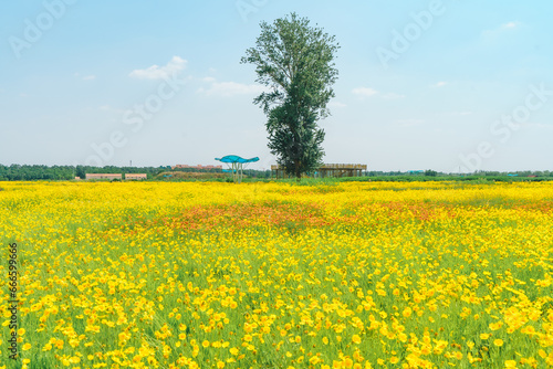 © 拾海月, Obraz premium A large sea of coreopsis flowers blooming outdoors with a lonely tree