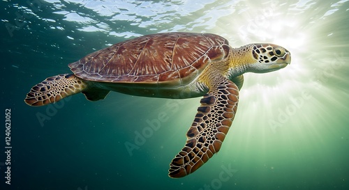 © Ulfiatul Savira, Fototapeta premium A large sea turtle gracefully swimming through a sunlit oceanic current.