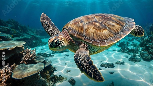 Obraz premium A large sea turtle swims through a vibrant coral reef