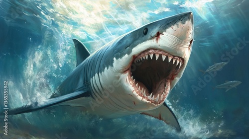 © Artittaya, Naklejka premium A large shark lunges forward, its mouth wide open and teeth exposed in a fearsome underwater scene