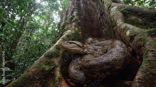 Naklejka premium A large snake rests on the exposed roots of a massive tree surrounded by thick foliage in a vibrant rainforest. Sunlight filters through the leaves, highlighting the snake's scales