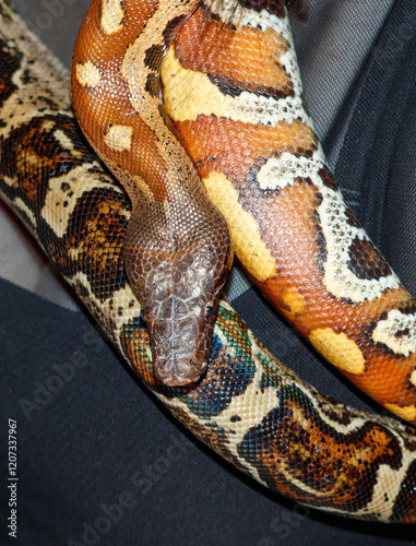 © schankz, Obraz premium A large snake with a brown and yellow pattern is laying on a person's arm