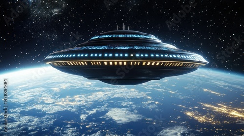 © anis rohayati, Obraz premium A large spaceship above Earth, with a glowing energy field, background wallpaper AI generated image
