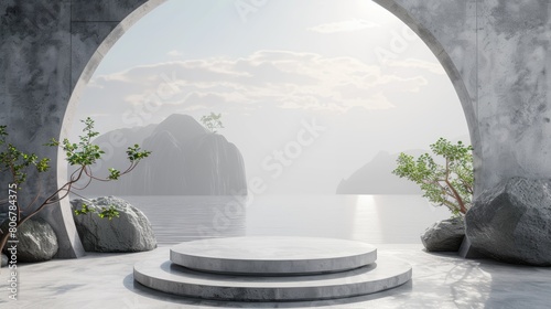 Fototapeta premium A large stone archway leads to a beautiful, serene lake