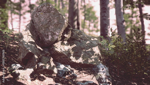 Obraz premium A large stone rests quietly on the forest floor, surrounded by lush greenery...