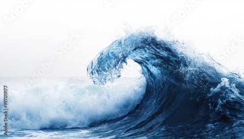 © Kiran, Obraz premium A large, stormy sea wave captured in deep blue, isolated against a white background to emphasize the power and mood of the ocean