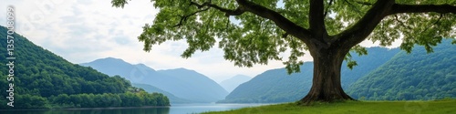 © Andrii Zastrozhnov, Naklejka premium A large tree is in the foreground of a beautiful mountain landscape. The tree is surrounded by a lush green field and a calm lake. The scene is serene and peaceful