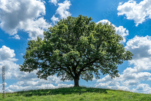 © Jiranun, Obraz premium A large tree on a grassy hill.