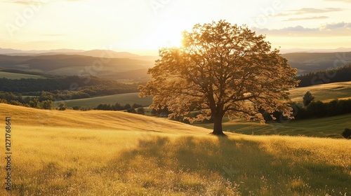 Fototapeta premium A large tree standing alone in a golden field during sunset, with mountains...