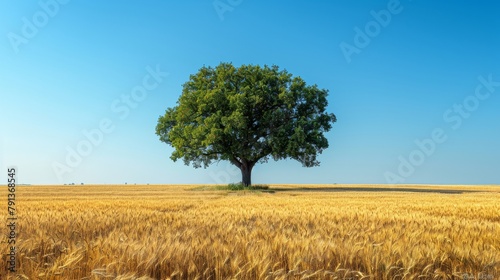 © Exnoi, Obraz premium A large tree stands in a field of golden wheat