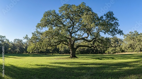 © Galaxyd, Obraz premium A large tree stands in a sunlit grassy field under a clear sky.