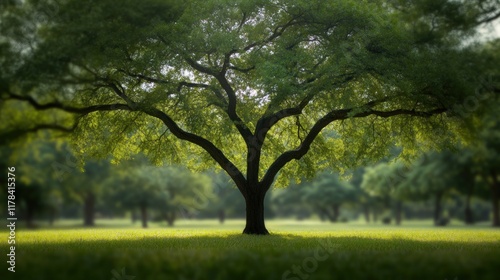 Fototapeta premium A large tree stands prominently in a peaceful green landscape, surrounded by soft light.