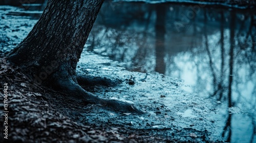 © embun, Fototapeta premium A large tree trunk beside a calm reflective body of water
