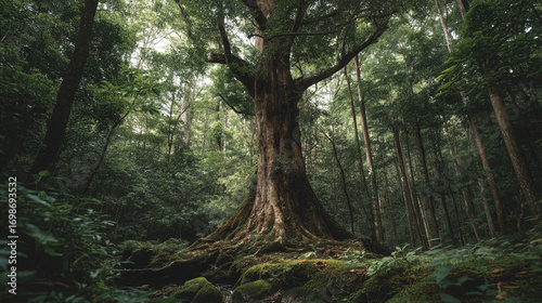 © Sabana, Fototapeta premium A large tree with exposed roots in a dense forest with green foliage and mossy rocks on the ground