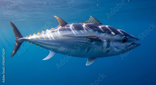 Fototapeta premium A large tuna swimming in the deep blue ocean water, a powerful marine predator.
