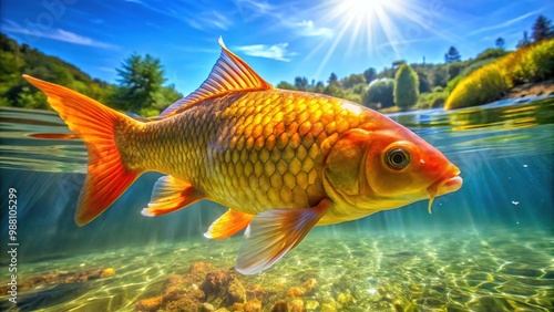 Naklejka premium A large, vibrant orange-and-yellow carp glides effortlessly through sunlit...