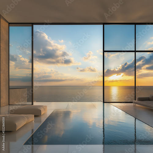 Fototapeta premium A large wall mirror reflecting a calm ocean view enhances serene spaces with...