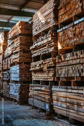 Fototapeta premium A large warehouse filled with many wooden planks stored on shelves