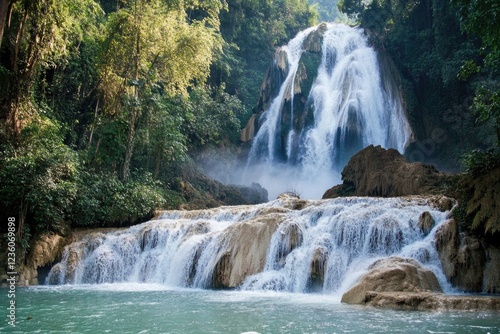 Fototapeta premium A large waterfall cascading down in a dense forest