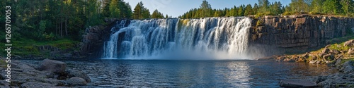 © Fotograf, Fototapeta premium A large waterfall flows down the mountain side, surrounded by lush greenery
