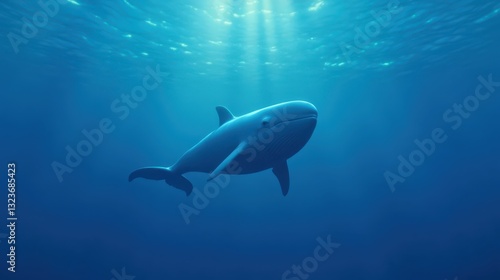 © Blackmint Studio, Obraz premium A large whale swims gracefully in the deep blue ocean, surrounded by tranquil waters. Sunlight streams down from the surface, creating a serene atmosphere