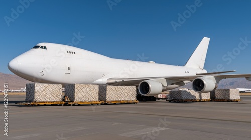 © sunchai, Obraz premium A large white cargo airplane parked on a sunny tarmac, loaded with multiple pallets, under a clear blue sky.