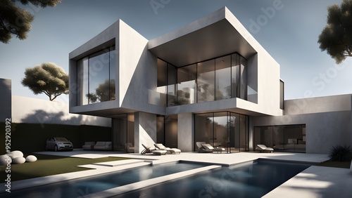 Fototapeta premium A large white house with a pool and a car in the driveway