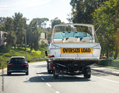 © F Armstrong Photo, Obraz premium A large white motor boat being hauled on a trailer with a yellow sign stating Oversize Load