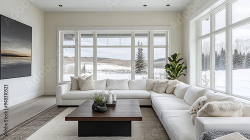 Fototapeta premium A large white sectional sofa is in a living room with a large window