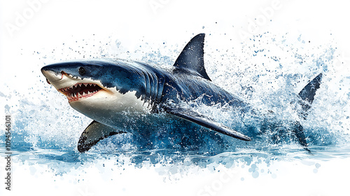 © Tabinda, Fototapeta premium A large white shark is leaping out of water, with waves splashing around it.