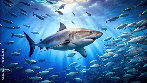 Fototapeta premium A large white shark swims in a school of fish against a clear blue...