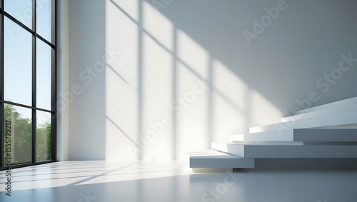 © Stock Shop, Obraz premium A large window illuminates a minimalist white room with a grand staircase