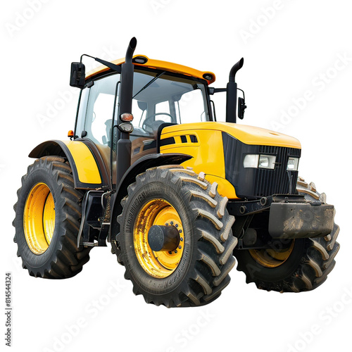 © Khritthithat, Obraz premium A large yellow modern tractor, equipped with advanced farming technology, isolated on a black background.