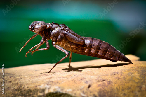 © Brinja, Fototapeta premium A larva, an empty nymph, of a dragon fly, a bubble tube, looking like a monster