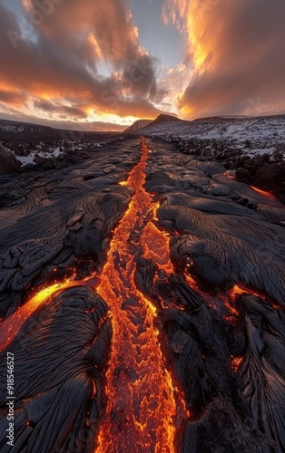 © imagineRbc, Fototapeta premium A lava flow is seen in the distance, with the sun setting in the background. The scene is both beautiful and dangerous, as the lava is hot and can cause harm to anyone who comes too close