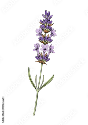 © Watercolor, Naklejka premium A lavender flower blossom illustration featuring detailed purple flowers and green stem on a softtoned background