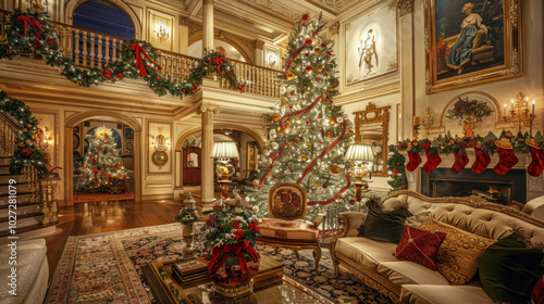 © Santy Hong, Obraz premium A lavish Christmas tree adorned with high-end designer ornaments, glowing in an elegant, upscale home