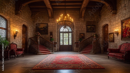 © Nad, Obraz premium A lavish lobby inside a renovated castle, featuring grand chandeliers, ornate tapestries, and antique furniture, with stone walls and a sweeping staircase leading to the upper floors