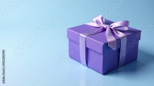 Obraz premium A Lavish Purple Gift Box with a Delicate Ribbon Bow on a Light Blue Background