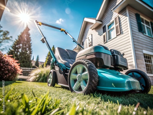 © Kate, Fototapeta premium A lawn mower is stands on a lawn in front of a house