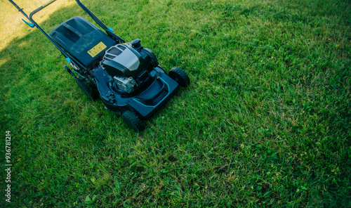 Fototapeta premium A lawn mower sits on a freshly cut lawn, ready for use in a well-maintained...